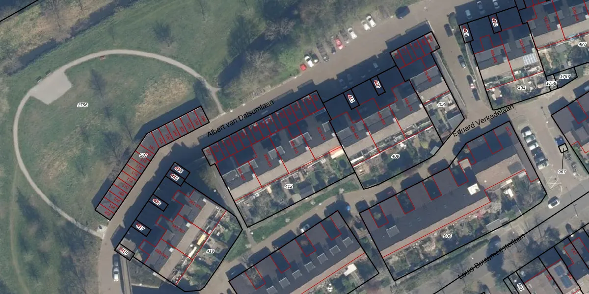 Het perceel waarop Albert van Dalsumlaan 409 staat heeft een oppervlakte van 1280 m². Dit is een zeer groot perceel. De perceeloppervlakte wordt geregistreerd door het Kadaster. Gedetailleerde informatie over de maten van dit perceel kunt u vinden in het rapport Kadastrale kaart met maatvoering van Albert van Dalsumlaan 409.