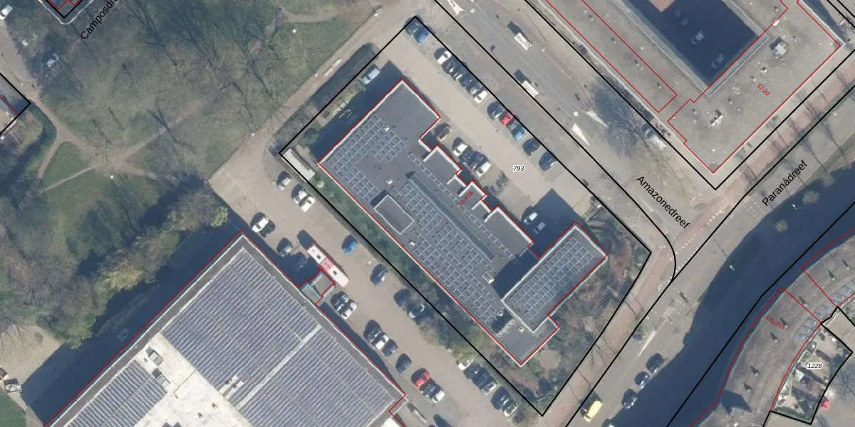 Het perceel waarop Amazonedreef 43 staat heeft een oppervlakte van 3739 m². Dit is een zeer groot perceel. De perceeloppervlakte wordt geregistreerd door het Kadaster. Gedetailleerde informatie over de maten van dit perceel kunt u vinden in het rapport Kadastrale kaart met maatvoering van Amazonedreef 43.