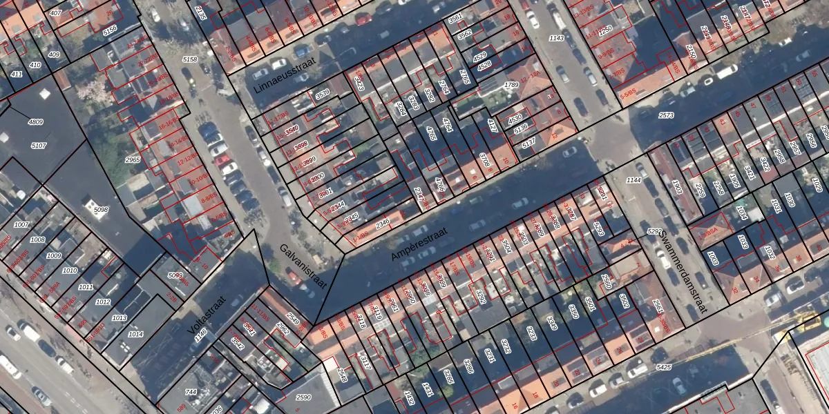Het perceel waarop Ampèrestraat 2-C staat heeft een oppervlakte van 99 m². Dit is een klein perceel. De perceeloppervlakte wordt geregistreerd door het Kadaster. Gedetailleerde informatie over de maten van dit perceel kunt u vinden in het rapport Kadastrale kaart met maatvoering van Ampèrestraat 2-C.