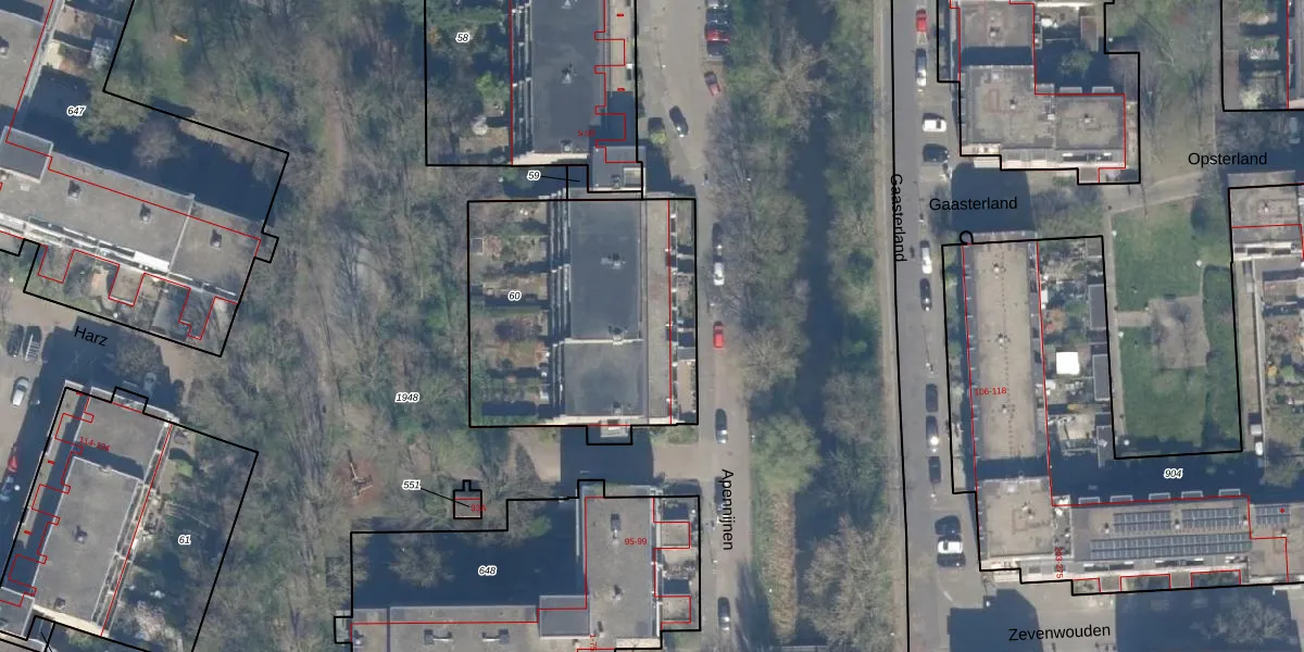 Het perceel waarop Apennijnen 87 staat heeft een oppervlakte van 1225 m². Dit is een zeer groot perceel. De perceeloppervlakte wordt geregistreerd door het Kadaster. Gedetailleerde informatie over de maten van dit perceel kunt u vinden in het rapport Kadastrale kaart met maatvoering van Apennijnen 87.