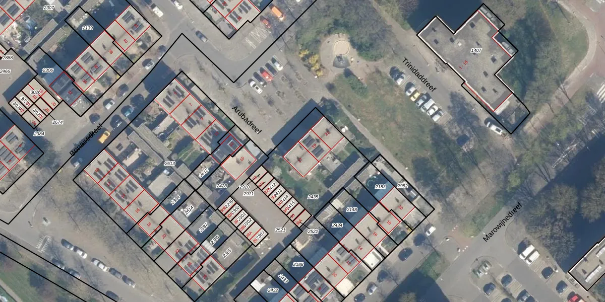 Het perceel waarop Arubadreef 17 staat heeft een oppervlakte van 1121 m². Dit is een zeer groot perceel. De perceeloppervlakte wordt geregistreerd door het Kadaster. Gedetailleerde informatie over de maten van dit perceel kunt u vinden in het rapport Kadastrale kaart met maatvoering van Arubadreef 17.