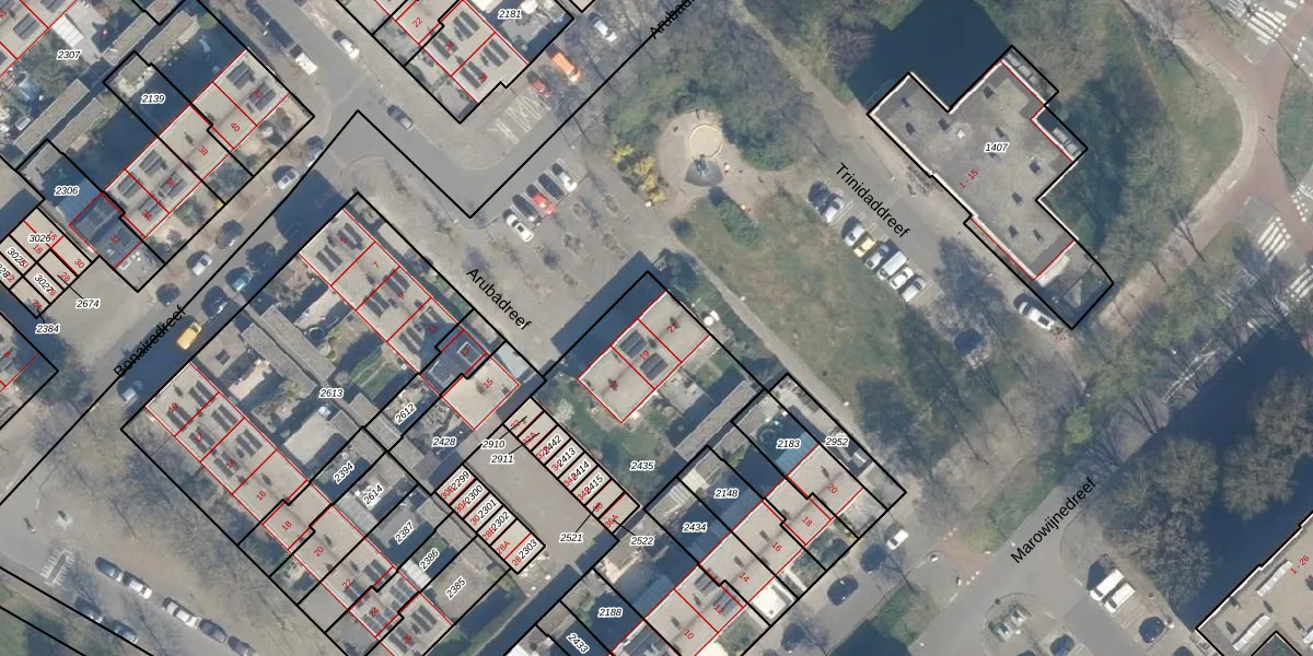 Het perceel waarop Arubadreef 21 staat heeft een oppervlakte van 1121 m². Dit is een zeer groot perceel. De perceeloppervlakte wordt geregistreerd door het Kadaster. Gedetailleerde informatie over de maten van dit perceel kunt u vinden in het rapport Kadastrale kaart met maatvoering van Arubadreef 21.