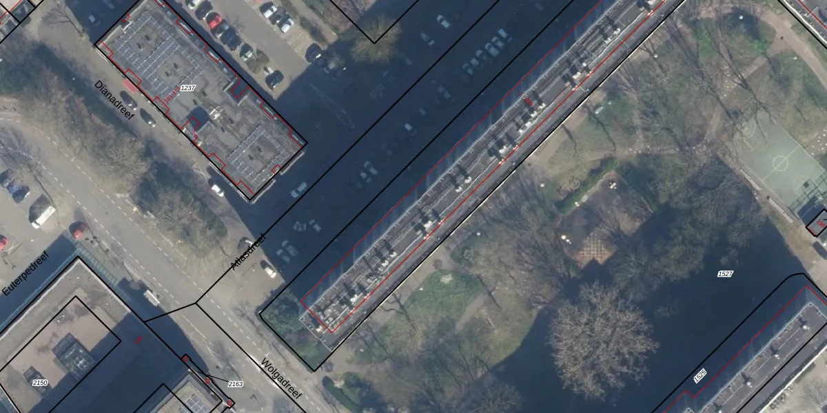 Het perceel waarop Atlasdreef 105 staat heeft een oppervlakte van 4733 m². Dit is een zeer groot perceel. De perceeloppervlakte wordt geregistreerd door het Kadaster. Gedetailleerde informatie over de maten van dit perceel kunt u vinden in het rapport Kadastrale kaart met maatvoering van Atlasdreef 105.