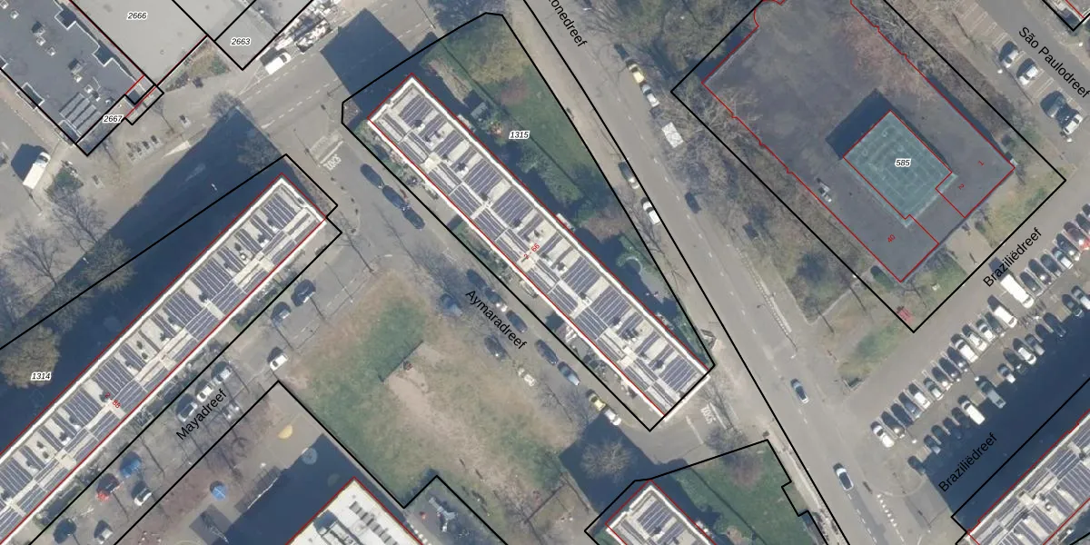 Het perceel waarop Aymaradreef 36 staat heeft een oppervlakte van 2135 m². Dit is een zeer groot perceel. De perceeloppervlakte wordt geregistreerd door het Kadaster. Gedetailleerde informatie over de maten van dit perceel kunt u vinden in het rapport Kadastrale kaart met maatvoering van Aymaradreef 36.