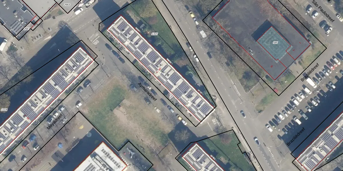 Het perceel waarop Aymaradreef 44 staat heeft een oppervlakte van 2135 m². Dit is een zeer groot perceel. De perceeloppervlakte wordt geregistreerd door het Kadaster. Gedetailleerde informatie over de maten van dit perceel kunt u vinden in het rapport Kadastrale kaart met maatvoering van Aymaradreef 44.