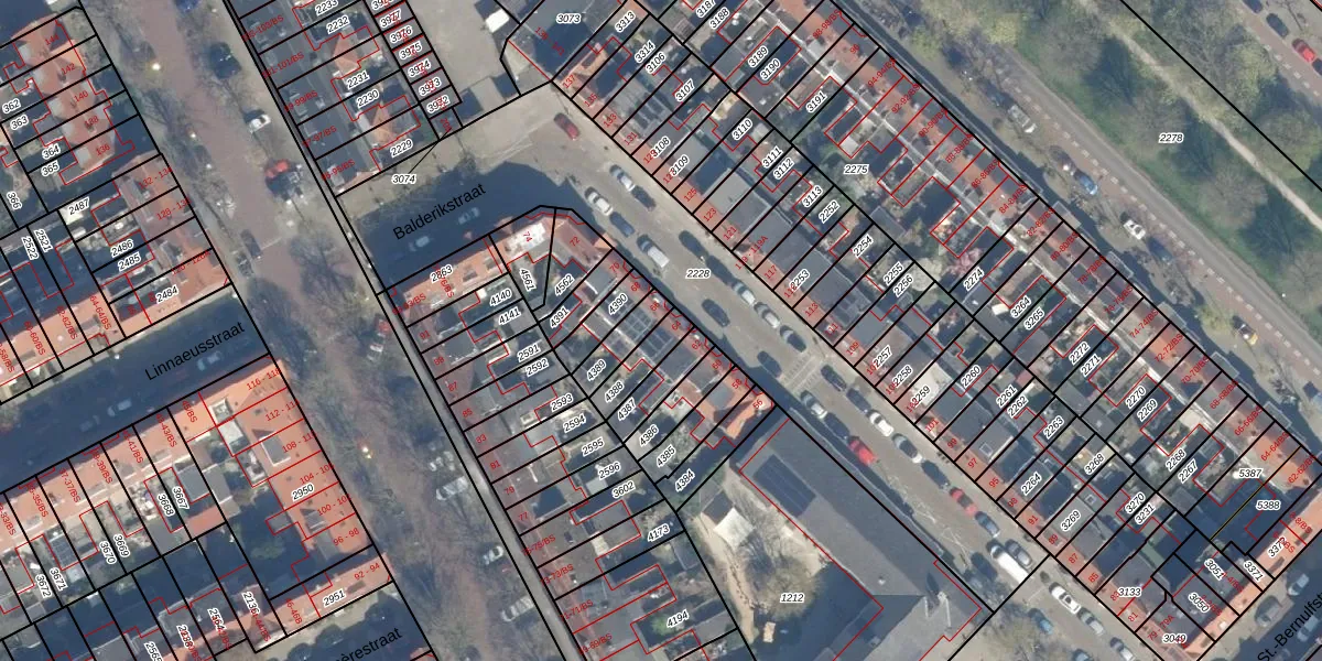 Het perceel waarop Balderikstraat 64 staat heeft een oppervlakte van 83 m². Dit is een klein perceel. De perceeloppervlakte wordt geregistreerd door het Kadaster. Gedetailleerde informatie over de maten van dit perceel kunt u vinden in het rapport Kadastrale kaart met maatvoering van Balderikstraat 64.