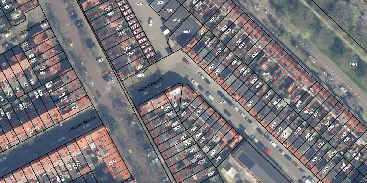 Het perceel waarop Balderikstraat 72 staat heeft een oppervlakte van 92 m². Dit is een klein perceel. De perceeloppervlakte wordt geregistreerd door het Kadaster. Gedetailleerde informatie over de maten van dit perceel kunt u vinden in het rapport Kadastrale kaart met maatvoering van Balderikstraat 72.