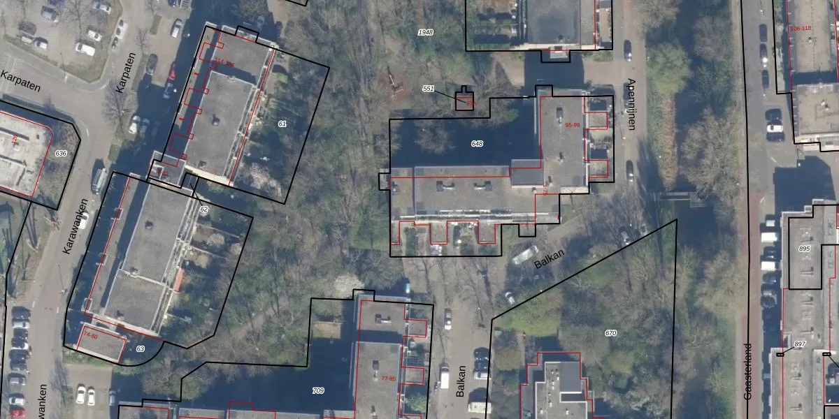 Het perceel waarop Balkan 73 staat heeft een oppervlakte van 1630 m². Dit is een zeer groot perceel. De perceeloppervlakte wordt geregistreerd door het Kadaster. Gedetailleerde informatie over de maten van dit perceel kunt u vinden in het rapport Kadastrale kaart met maatvoering van Balkan 73.