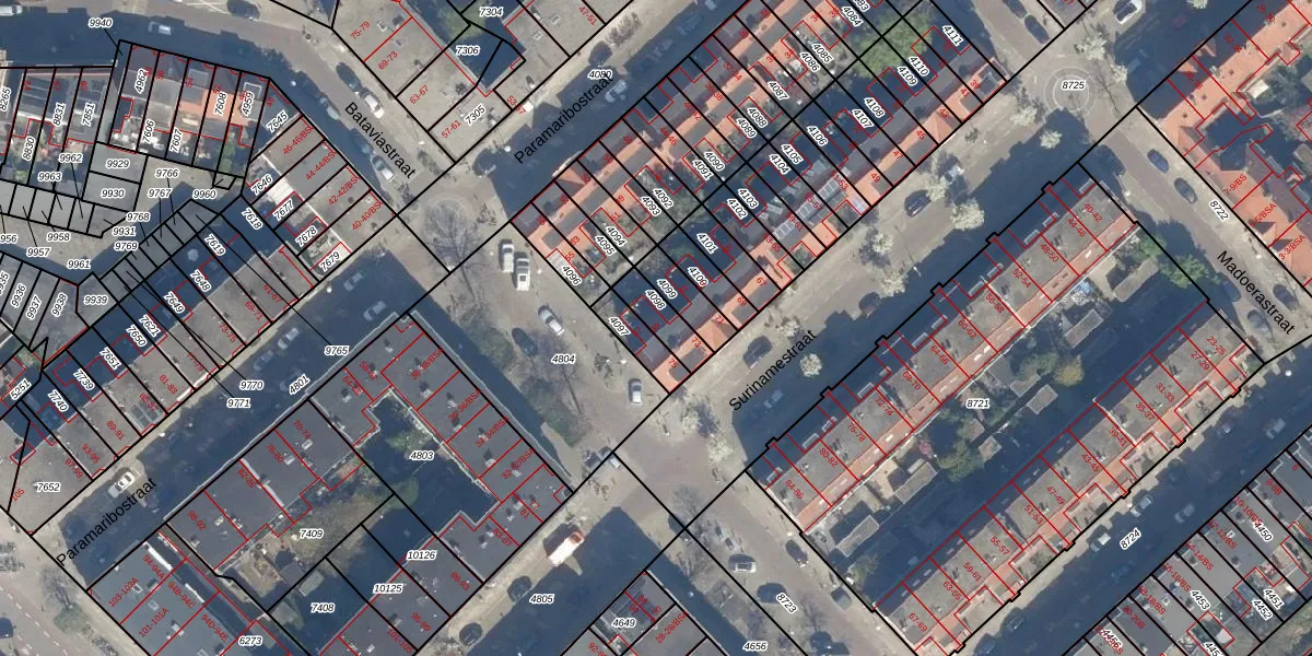 Het perceel waarop Bataviastraat 39 staat heeft een oppervlakte van 83 m². Dit is een klein perceel. De perceeloppervlakte wordt geregistreerd door het Kadaster. Gedetailleerde informatie over de maten van dit perceel kunt u vinden in het rapport Kadastrale kaart met maatvoering van Bataviastraat 39.