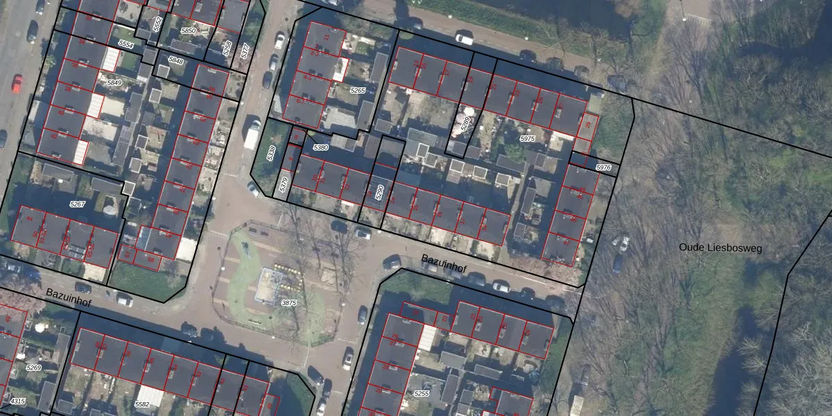 Het perceel waarop Bazuinhof 15 staat heeft een oppervlakte van 2822 m². Dit is een zeer groot perceel. De perceeloppervlakte wordt geregistreerd door het Kadaster. Gedetailleerde informatie over de maten van dit perceel kunt u vinden in het rapport Kadastrale kaart met maatvoering van Bazuinhof 15.