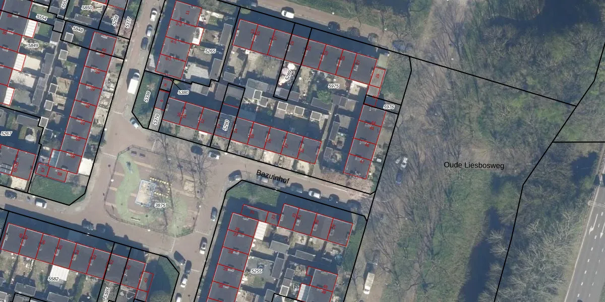 Het perceel waarop Bazuinhof 18 staat heeft een oppervlakte van 2822 m². Dit is een zeer groot perceel. De perceeloppervlakte wordt geregistreerd door het Kadaster. Gedetailleerde informatie over de maten van dit perceel kunt u vinden in het rapport Kadastrale kaart met maatvoering van Bazuinhof 18.