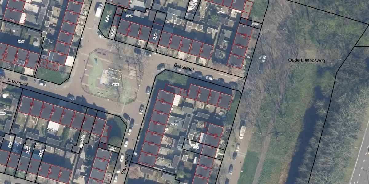 Het perceel waarop Bazuinhof 23 staat heeft een oppervlakte van 2870 m². Dit is een zeer groot perceel. De perceeloppervlakte wordt geregistreerd door het Kadaster. Gedetailleerde informatie over de maten van dit perceel kunt u vinden in het rapport Kadastrale kaart met maatvoering van Bazuinhof 23.