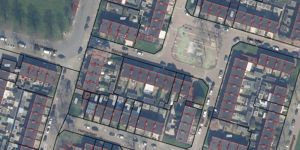 Het perceel waarop Bazuinhof 45 staat heeft een oppervlakte van 2329 m². Dit is een zeer groot perceel. De perceeloppervlakte wordt geregistreerd door het Kadaster. Gedetailleerde informatie over de maten van dit perceel kunt u vinden in het rapport Kadastrale kaart met maatvoering van Bazuinhof 45.