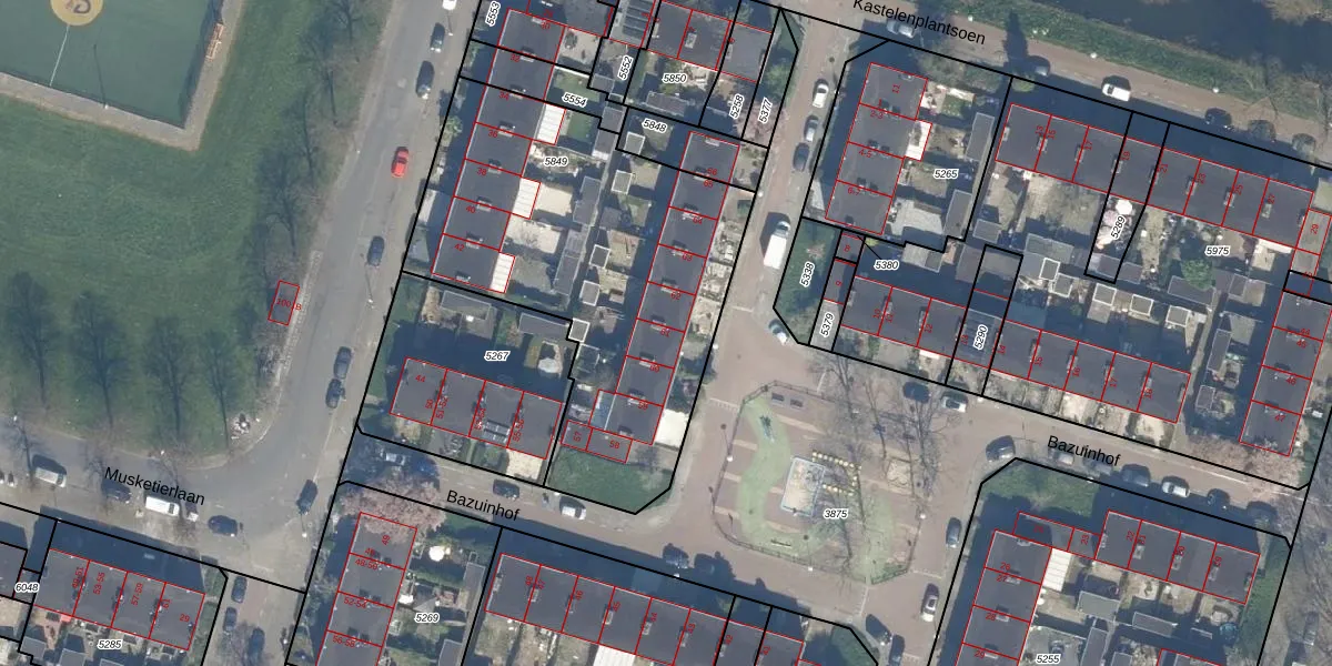 Het perceel waarop Bazuinhof 61 staat heeft een oppervlakte van 1825 m². Dit is een zeer groot perceel. De perceeloppervlakte wordt geregistreerd door het Kadaster. Gedetailleerde informatie over de maten van dit perceel kunt u vinden in het rapport Kadastrale kaart met maatvoering van Bazuinhof 61.