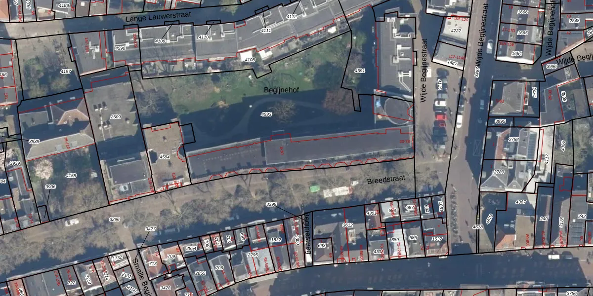 Het perceel waarop Begijnehof 23 staat heeft een oppervlakte van 2829 m². Dit is een zeer groot perceel. De perceeloppervlakte wordt geregistreerd door het Kadaster. Gedetailleerde informatie over de maten van dit perceel kunt u vinden in het rapport Kadastrale kaart met maatvoering van Begijnehof 23.