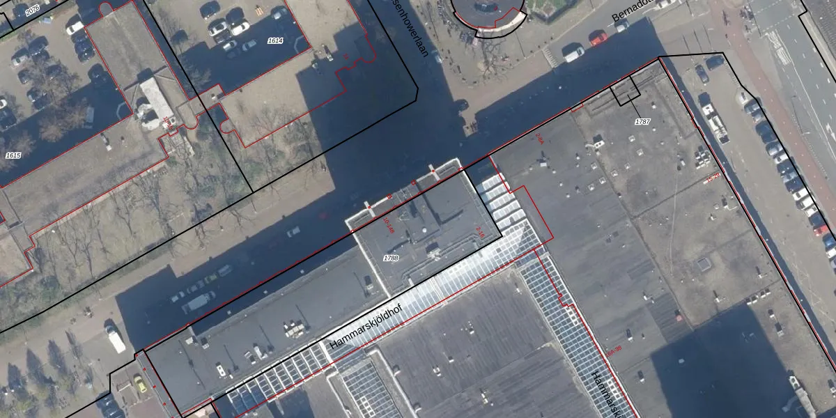 Het perceel waarop Bernadottelaan 44 staat heeft een oppervlakte van 1614 m². Dit is een zeer groot perceel. De perceeloppervlakte wordt geregistreerd door het Kadaster. Gedetailleerde informatie over de maten van dit perceel kunt u vinden in het rapport Kadastrale kaart met maatvoering van Bernadottelaan 44.