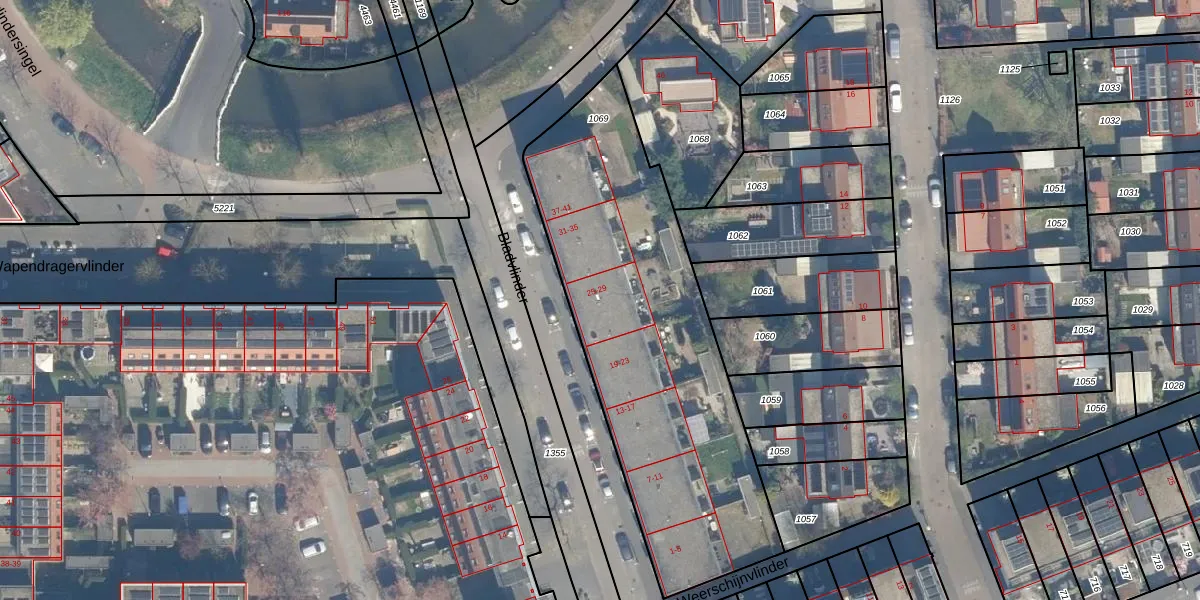 Bladvlinder 25 is gelegen op kadastraal perceel CTR00F1069. Deze kadastrale aanduiding is uniek en wordt gebruikt door het Kadaster om eigendomsrechten en andere zakelijke rechten vast te leggen. Het perceel maakt onderdeel uit van de kadastrale gemeente Catharijne.