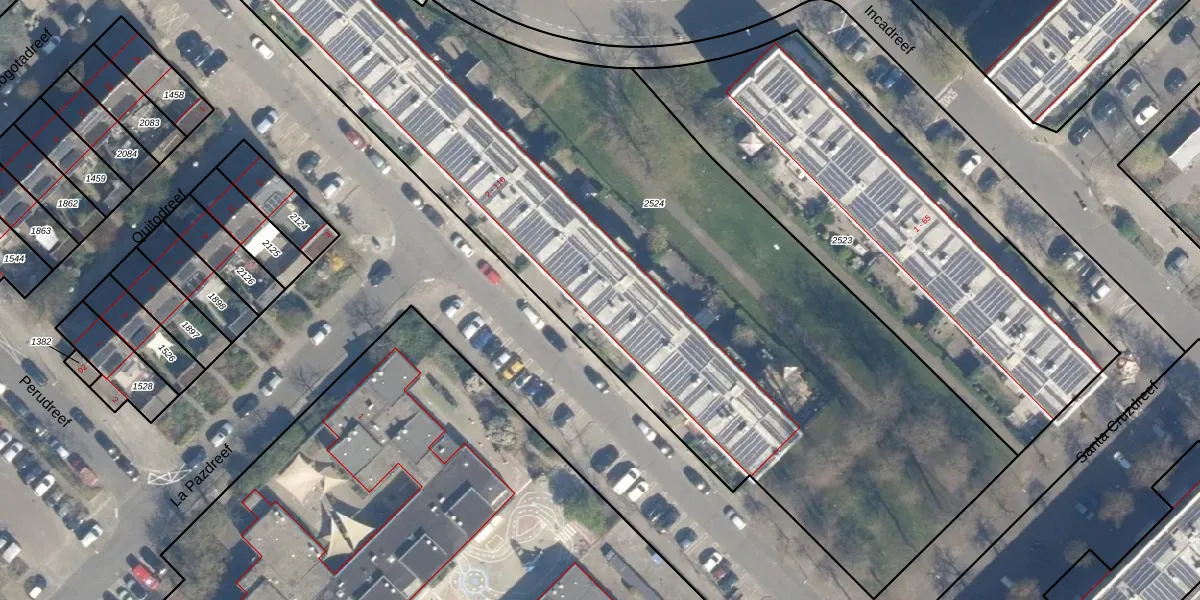 Het perceel waarop Boliviadreef 82 staat heeft een oppervlakte van 4965 m². Dit is een zeer groot perceel. De perceeloppervlakte wordt geregistreerd door het Kadaster. Gedetailleerde informatie over de maten van dit perceel kunt u vinden in het rapport Kadastrale kaart met maatvoering van Boliviadreef 82.