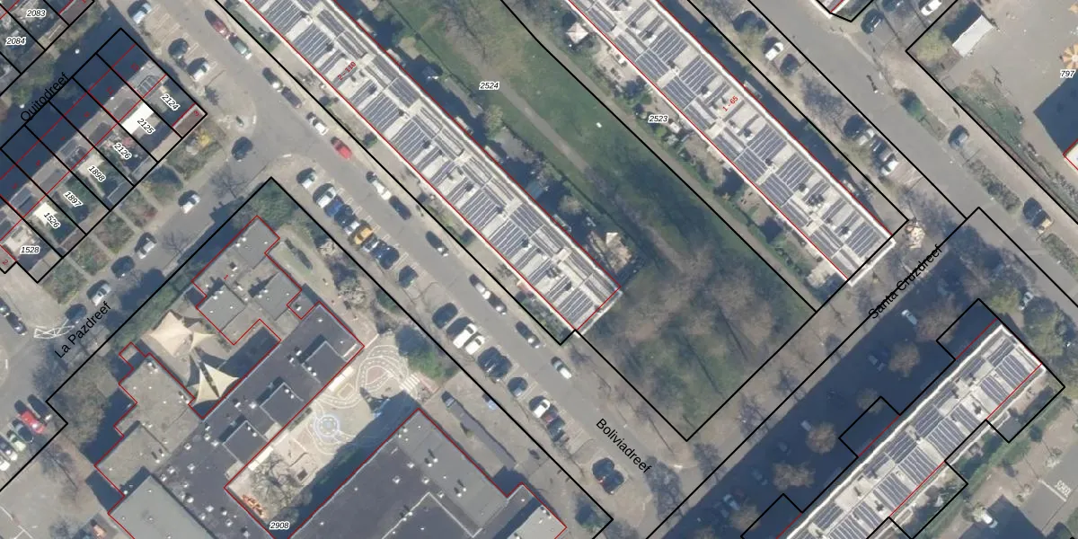 Het perceel waarop Boliviadreef 96 staat heeft een oppervlakte van 4965 m². Dit is een zeer groot perceel. De perceeloppervlakte wordt geregistreerd door het Kadaster. Gedetailleerde informatie over de maten van dit perceel kunt u vinden in het rapport Kadastrale kaart met maatvoering van Boliviadreef 96.