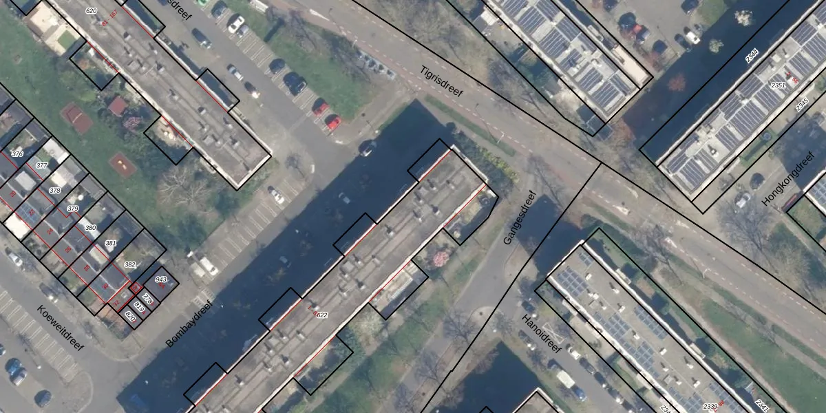Het perceel waarop Bombaydreef 83 staat heeft een oppervlakte van 1746 m². Dit is een zeer groot perceel. De perceeloppervlakte wordt geregistreerd door het Kadaster. Gedetailleerde informatie over de maten van dit perceel kunt u vinden in het rapport Kadastrale kaart met maatvoering van Bombaydreef 83.
