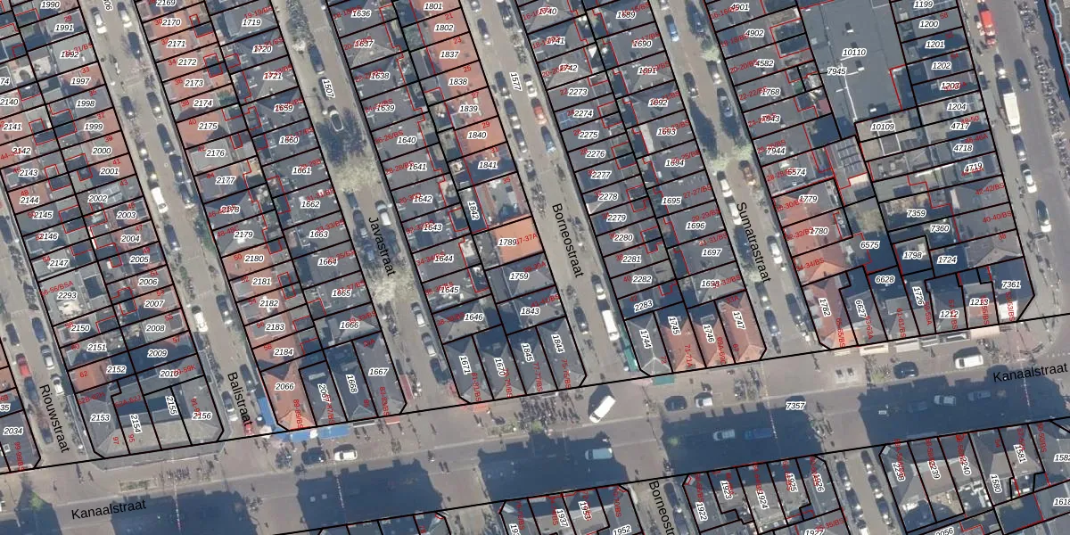 Het perceel waarop Borneostraat 39-BS staat heeft een oppervlakte van 79 m². Dit is een klein perceel. De perceeloppervlakte wordt geregistreerd door het Kadaster. Gedetailleerde informatie over de maten van dit perceel kunt u vinden in het rapport Kadastrale kaart met maatvoering van Borneostraat 39-BS.