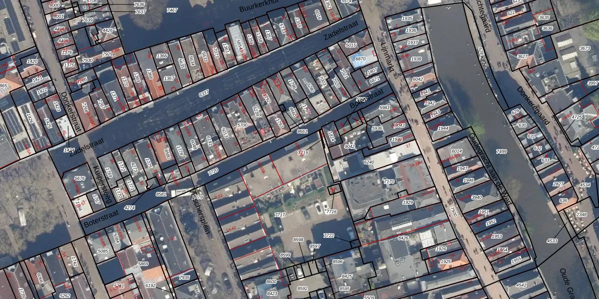 Het perceel waarop Boterstraat 12-B staat heeft een oppervlakte van 1608 m². Dit is een zeer groot perceel. De perceeloppervlakte wordt geregistreerd door het Kadaster. Gedetailleerde informatie over de maten van dit perceel kunt u vinden in het rapport Kadastrale kaart met maatvoering van Boterstraat 12-B.