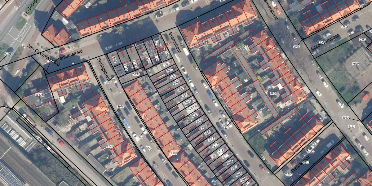 Het perceel waarop Bremstraat 96 staat heeft een oppervlakte van 61 m². Dit is een klein perceel. De perceeloppervlakte wordt geregistreerd door het Kadaster. Gedetailleerde informatie over de maten van dit perceel kunt u vinden in het rapport Kadastrale kaart met maatvoering van Bremstraat 96.