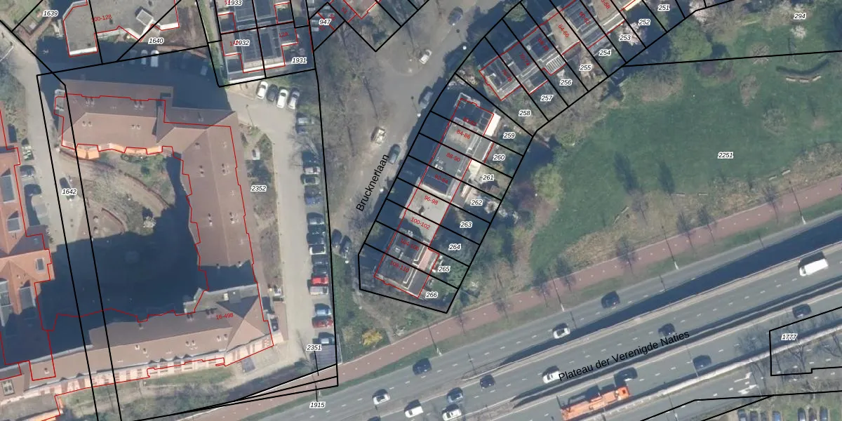 Brucknerlaan 96 is gelegen op kadastraal perceel UTT00S263. Deze kadastrale aanduiding is uniek en wordt gebruikt door het Kadaster om eigendomsrechten en andere zakelijke rechten vast te leggen. Het perceel maakt onderdeel uit van de kadastrale gemeente Utrecht.