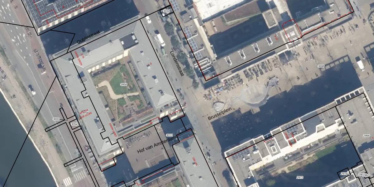 Het perceel waarop Brusselplein 1 staat heeft een oppervlakte van 9395 m². Dit is een zeer groot perceel. De perceeloppervlakte wordt geregistreerd door het Kadaster. Gedetailleerde informatie over de maten van dit perceel kunt u vinden in het rapport Kadastrale kaart met maatvoering van Brusselplein 1.