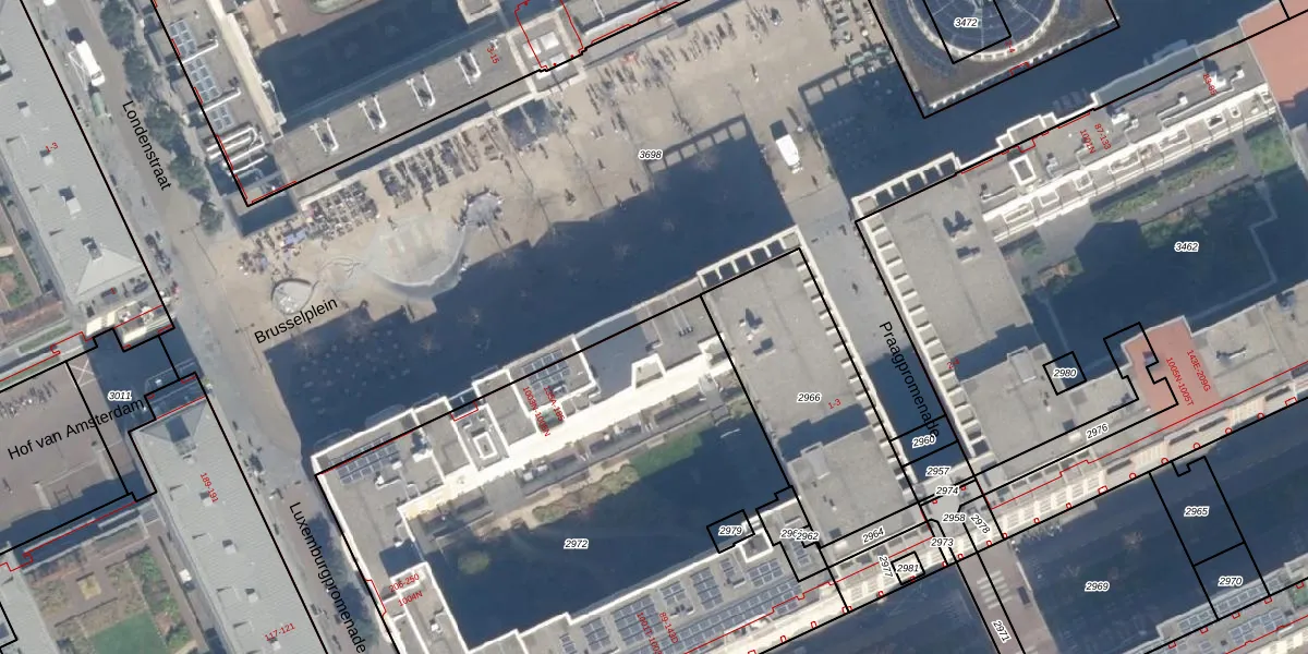 Het perceel waarop Brusselplein 151 staat heeft een oppervlakte van 3386 m². Dit is een zeer groot perceel. De perceeloppervlakte wordt geregistreerd door het Kadaster. Gedetailleerde informatie over de maten van dit perceel kunt u vinden in het rapport Kadastrale kaart met maatvoering van Brusselplein 151.