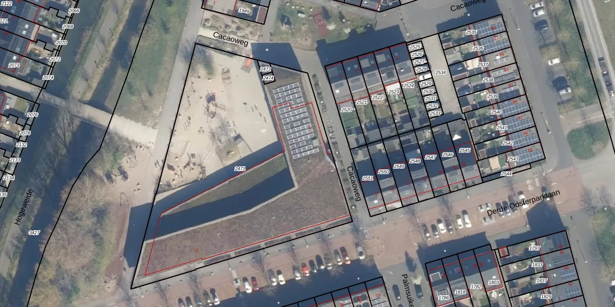 Het perceel waarop Cacaoweg 1 staat heeft een oppervlakte van 3434 m². Dit is een zeer groot perceel. De perceeloppervlakte wordt geregistreerd door het Kadaster. Gedetailleerde informatie over de maten van dit perceel kunt u vinden in het rapport Kadastrale kaart met maatvoering van Cacaoweg 1.