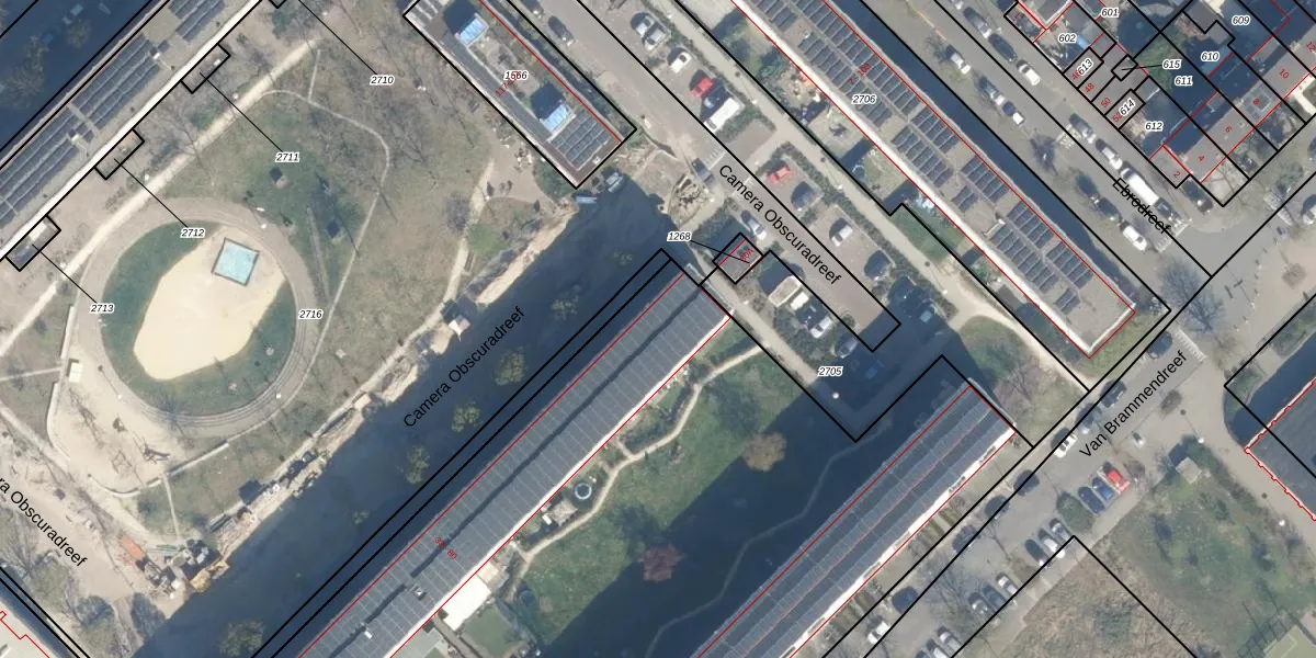 Het perceel waarop Camera Obscuradreef 77 staat heeft een oppervlakte van 8147 m². Dit is een zeer groot perceel. De perceeloppervlakte wordt geregistreerd door het Kadaster. Gedetailleerde informatie over de maten van dit perceel kunt u vinden in het rapport Kadastrale kaart met maatvoering van Camera Obscuradreef 77.