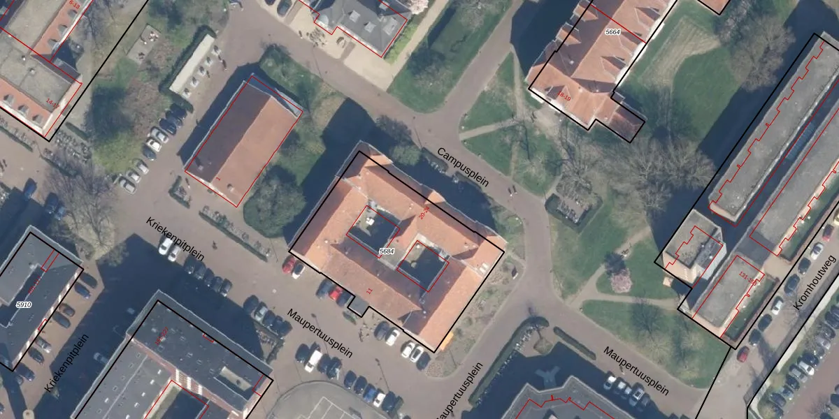Het perceel waarop Campusplein 23 staat heeft een oppervlakte van 1237 m². Dit is een zeer groot perceel. De perceeloppervlakte wordt geregistreerd door het Kadaster. Gedetailleerde informatie over de maten van dit perceel kunt u vinden in het rapport Kadastrale kaart met maatvoering van Campusplein 23.