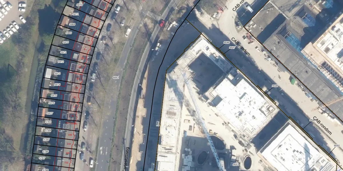 Het perceel waarop Cartesiusweg 20 staat heeft een oppervlakte van 9799 m². Dit is een zeer groot perceel. De perceeloppervlakte wordt geregistreerd door het Kadaster. Gedetailleerde informatie over de maten van dit perceel kunt u vinden in het rapport Kadastrale kaart met maatvoering van Cartesiusweg 20.