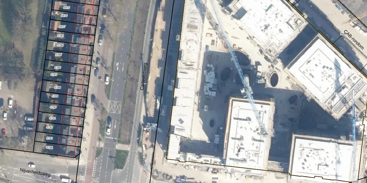 Het perceel waarop Cartesiusweg 42 staat heeft een oppervlakte van 9799 m². Dit is een zeer groot perceel. De perceeloppervlakte wordt geregistreerd door het Kadaster. Gedetailleerde informatie over de maten van dit perceel kunt u vinden in het rapport Kadastrale kaart met maatvoering van Cartesiusweg 42.