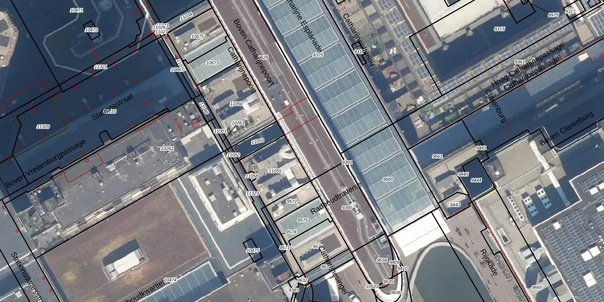 Het perceel waarop Catharijnepoort 1 staat heeft een oppervlakte van 1037 m². Dit is een zeer groot perceel. De perceeloppervlakte wordt geregistreerd door het Kadaster. Gedetailleerde informatie over de maten van dit perceel kunt u vinden in het rapport Kadastrale kaart met maatvoering van Catharijnepoort 1.