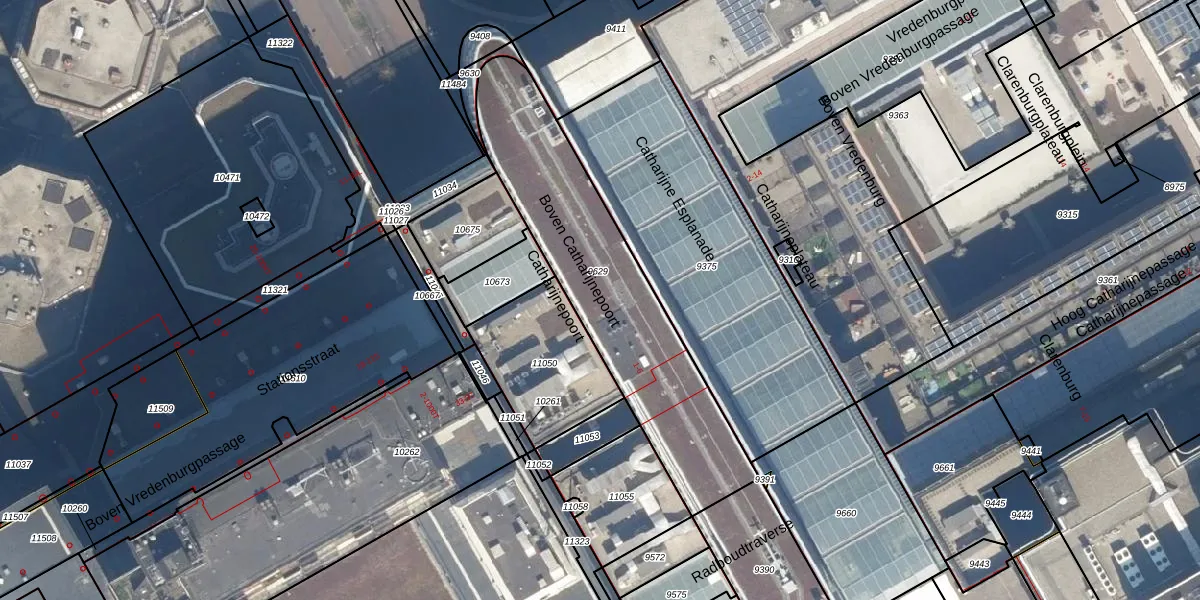 Het perceel waarop Catharijnepoort 8 staat heeft een oppervlakte van 1037 m². Dit is een zeer groot perceel. De perceeloppervlakte wordt geregistreerd door het Kadaster. Gedetailleerde informatie over de maten van dit perceel kunt u vinden in het rapport Kadastrale kaart met maatvoering van Catharijnepoort 8.