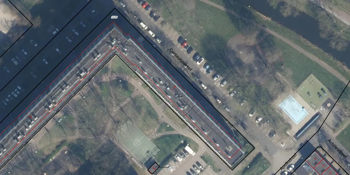 Het perceel waarop Centaurusdreef 104 staat heeft een oppervlakte van 4733 m². Dit is een zeer groot perceel. De perceeloppervlakte wordt geregistreerd door het Kadaster. Gedetailleerde informatie over de maten van dit perceel kunt u vinden in het rapport Kadastrale kaart met maatvoering van Centaurusdreef 104.