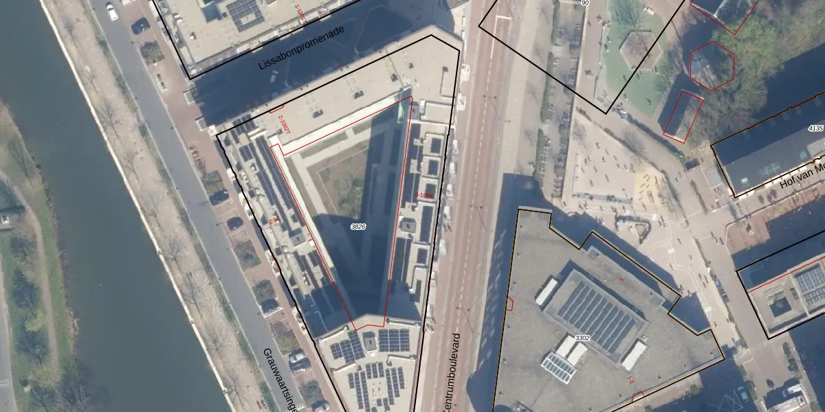 Het perceel waarop Centrumboulevard 71 staat heeft een oppervlakte van 3400 m². Dit is een zeer groot perceel. De perceeloppervlakte wordt geregistreerd door het Kadaster. Gedetailleerde informatie over de maten van dit perceel kunt u vinden in het rapport Kadastrale kaart met maatvoering van Centrumboulevard 71.