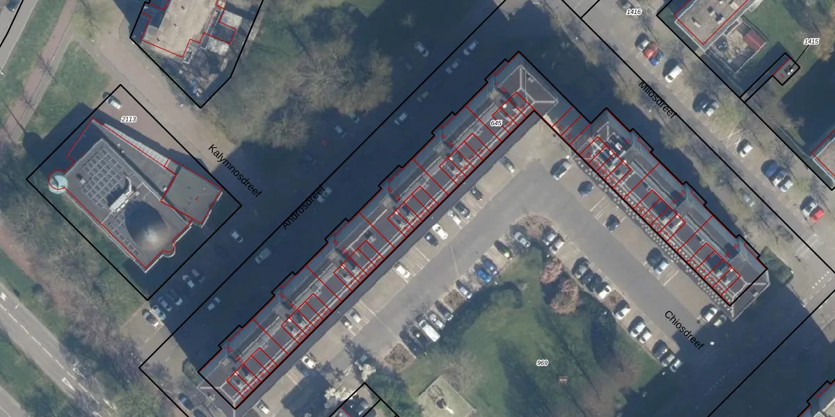 Het perceel waarop Chiosdreef 45 staat heeft een oppervlakte van 2218 m². Dit is een zeer groot perceel. De perceeloppervlakte wordt geregistreerd door het Kadaster. Gedetailleerde informatie over de maten van dit perceel kunt u vinden in het rapport Kadastrale kaart met maatvoering van Chiosdreef 45.
