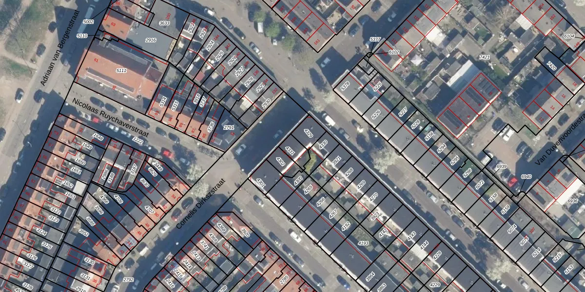 Het perceel waarop Cornelis Dirkszstraat 45 staat heeft een oppervlakte van 65 m². Dit is een klein perceel. De perceeloppervlakte wordt geregistreerd door het Kadaster. Gedetailleerde informatie over de maten van dit perceel kunt u vinden in het rapport Kadastrale kaart met maatvoering van Cornelis Dirkszstraat 45.