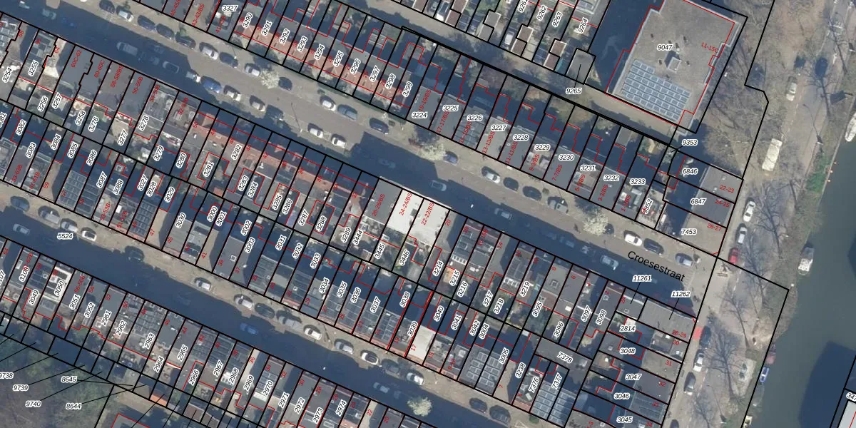 Croesestraat 22-BS is gelegen op kadastraal perceel CTR00D3446. Deze kadastrale aanduiding is uniek en wordt gebruikt door het Kadaster om eigendomsrechten en andere zakelijke rechten vast te leggen. Het perceel maakt onderdeel uit van de kadastrale gemeente Catharijne.