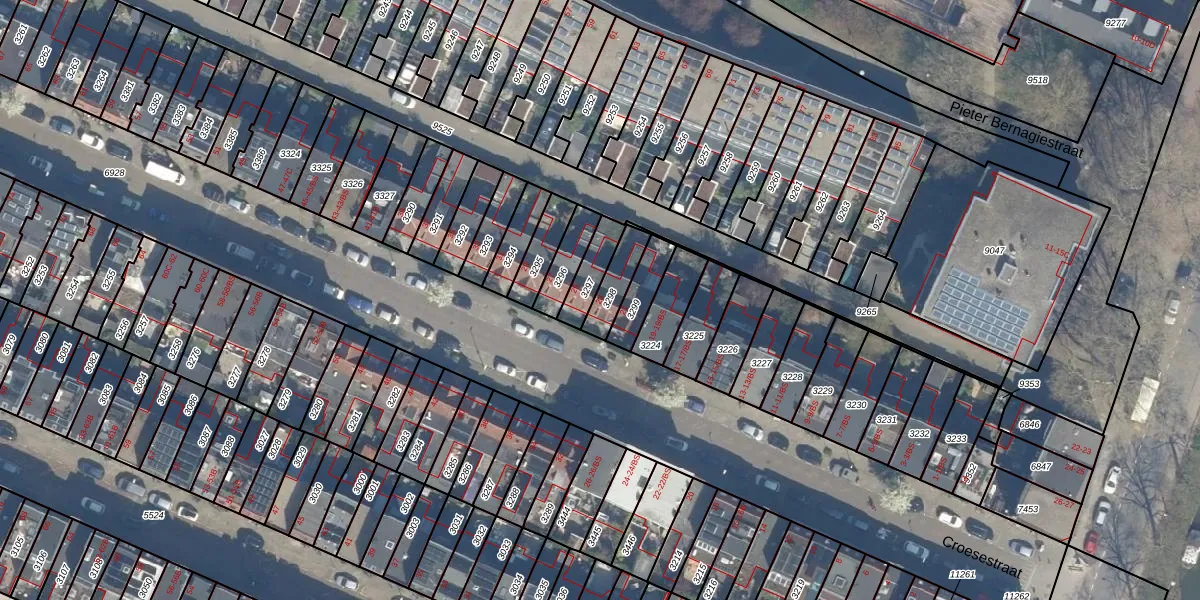 Het perceel waarop Croesestraat 23 staat heeft een oppervlakte van 86 m². Dit is een klein perceel. De perceeloppervlakte wordt geregistreerd door het Kadaster. Gedetailleerde informatie over de maten van dit perceel kunt u vinden in het rapport Kadastrale kaart met maatvoering van Croesestraat 23.