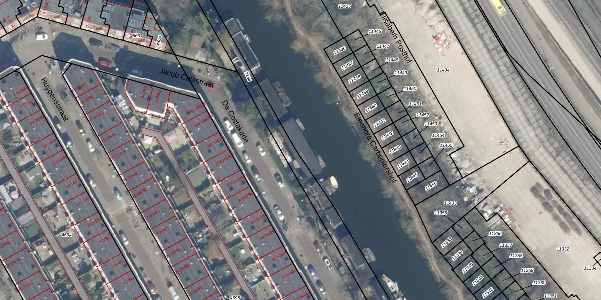 Het perceel waarop Da Costakade 117 staat heeft een oppervlakte van 2,4 ha. Dit is een zeer groot perceel. De perceeloppervlakte wordt geregistreerd door het Kadaster. Gedetailleerde informatie over de maten van dit perceel kunt u vinden in het rapport Kadastrale kaart met maatvoering van Da Costakade 117.