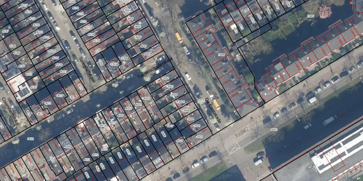 Het perceel waarop Da Costakade 12-A staat heeft een oppervlakte van 95 m². Dit is een klein perceel. De perceeloppervlakte wordt geregistreerd door het Kadaster. Gedetailleerde informatie over de maten van dit perceel kunt u vinden in het rapport Kadastrale kaart met maatvoering van Da Costakade 12-A.
