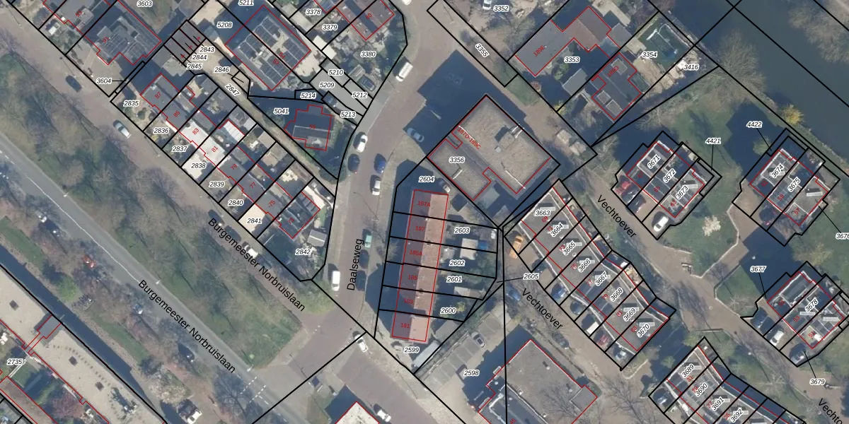 Daalseweg 187-A is gelegen op kadastraal perceel ZLN02B2604. Deze kadastrale aanduiding is uniek en wordt gebruikt door het Kadaster om eigendomsrechten en andere zakelijke rechten vast te leggen. Het perceel maakt onderdeel uit van de kadastrale gemeente Zuilen.