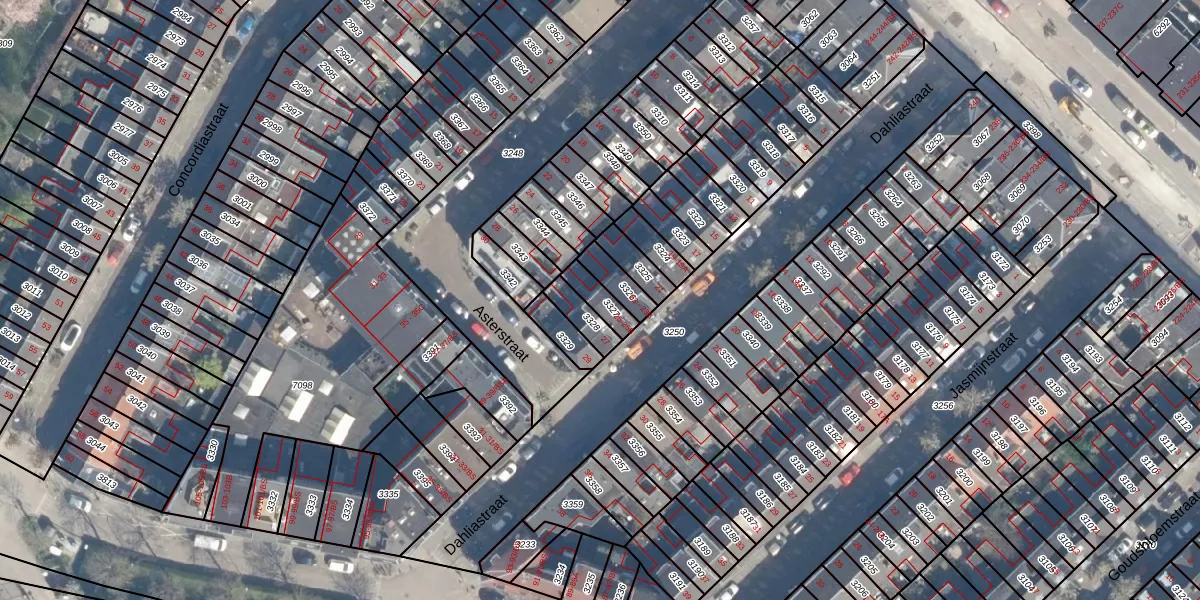 Het perceel waarop Dahliastraat 25-A staat heeft een oppervlakte van 59 m². Dit is een klein perceel. De perceeloppervlakte wordt geregistreerd door het Kadaster. Gedetailleerde informatie over de maten van dit perceel kunt u vinden in het rapport Kadastrale kaart met maatvoering van Dahliastraat 25-A.