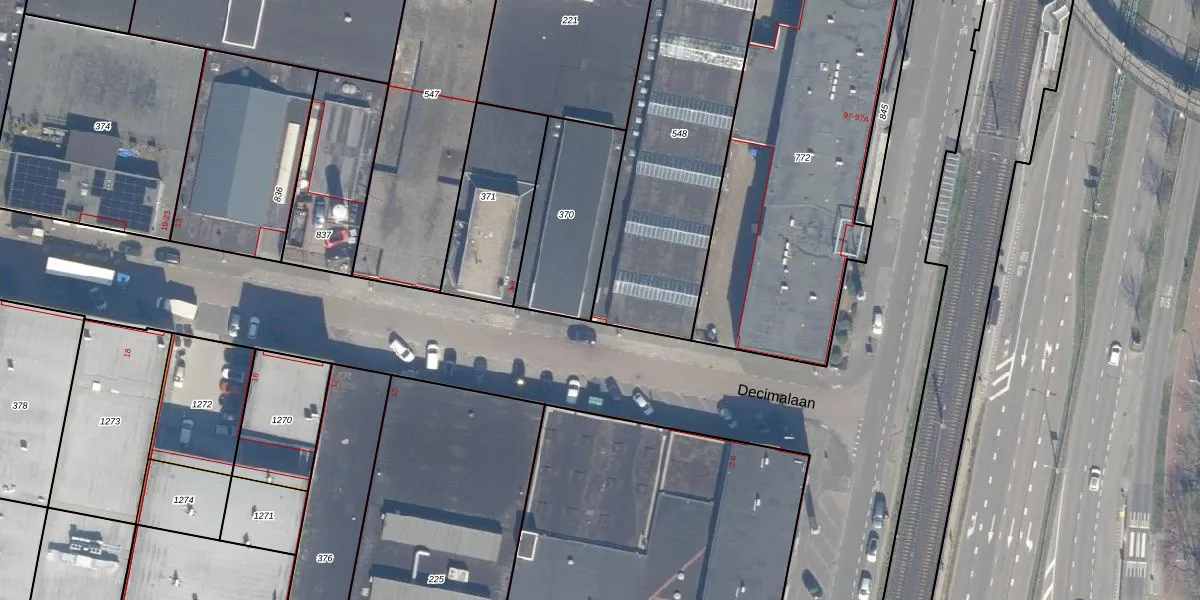 Het perceel waarop Decimalaan 3 staat heeft een oppervlakte van 1101 m². Dit is een zeer groot perceel. De perceeloppervlakte wordt geregistreerd door het Kadaster. Gedetailleerde informatie over de maten van dit perceel kunt u vinden in het rapport Kadastrale kaart met maatvoering van Decimalaan 3.