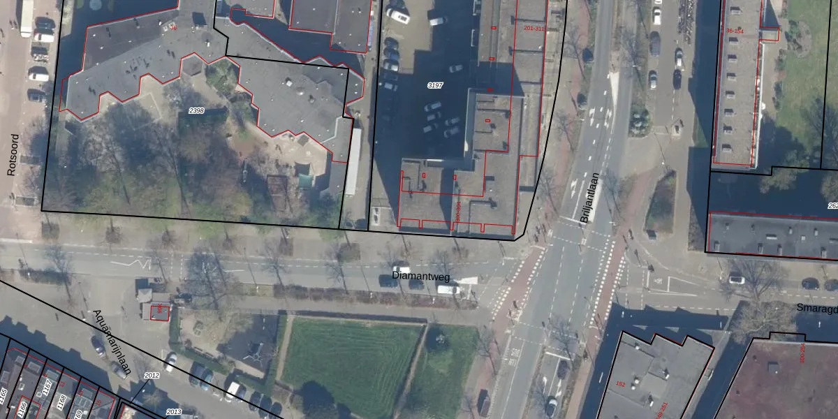 Het perceel waarop Diamantweg 300 staat heeft een oppervlakte van 2755 m². Dit is een zeer groot perceel. De perceeloppervlakte wordt geregistreerd door het Kadaster. Gedetailleerde informatie over de maten van dit perceel kunt u vinden in het rapport Kadastrale kaart met maatvoering van Diamantweg 300.