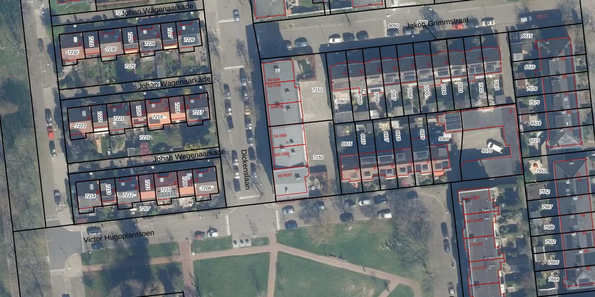 Het perceel waarop Dickenslaan 56-C staat heeft een oppervlakte van 557 m². Dit is een groot perceel. De perceeloppervlakte wordt geregistreerd door het Kadaster. Gedetailleerde informatie over de maten van dit perceel kunt u vinden in het rapport Kadastrale kaart met maatvoering van Dickenslaan 56-C.